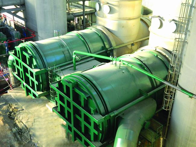 首先是设计。8月初公司签下尖峰冷却器合同后,公司领导立即安排宝钛设计室牛全兴和付亚杰等到上安电厂进行实地勘察。他们在现场看到,此机组有两个直径6M边缘间隔3M的排气管,按常规设计,需配两个冷却器,但两排气管间距和现场空间有限,传统设计根本无法实现基本的换热空间,若两个排气管共用一个冷却器,蒸气平衡、冷却量控制又是个难题,同时狭窄的现场也无法满足施工的基本要求。对此,他们回来后根据现场勘察的实际数据,与设计室其他人员一起共同研究探讨。他们设想过多套方案,最后在造型结构上突破瓶颈,终于设计出横向并排两组圆桶状壳体,纵向延伸空间,中间用方形仓串联,侧方进汽,横向布管,汽仓合二为一的方案。这个设计突破了常规套路,既解决了蒸汽平衡冷却量难以控制难题,又满足了换热空间,且有效地利用了场地,方案得到了厂方认可。